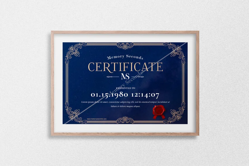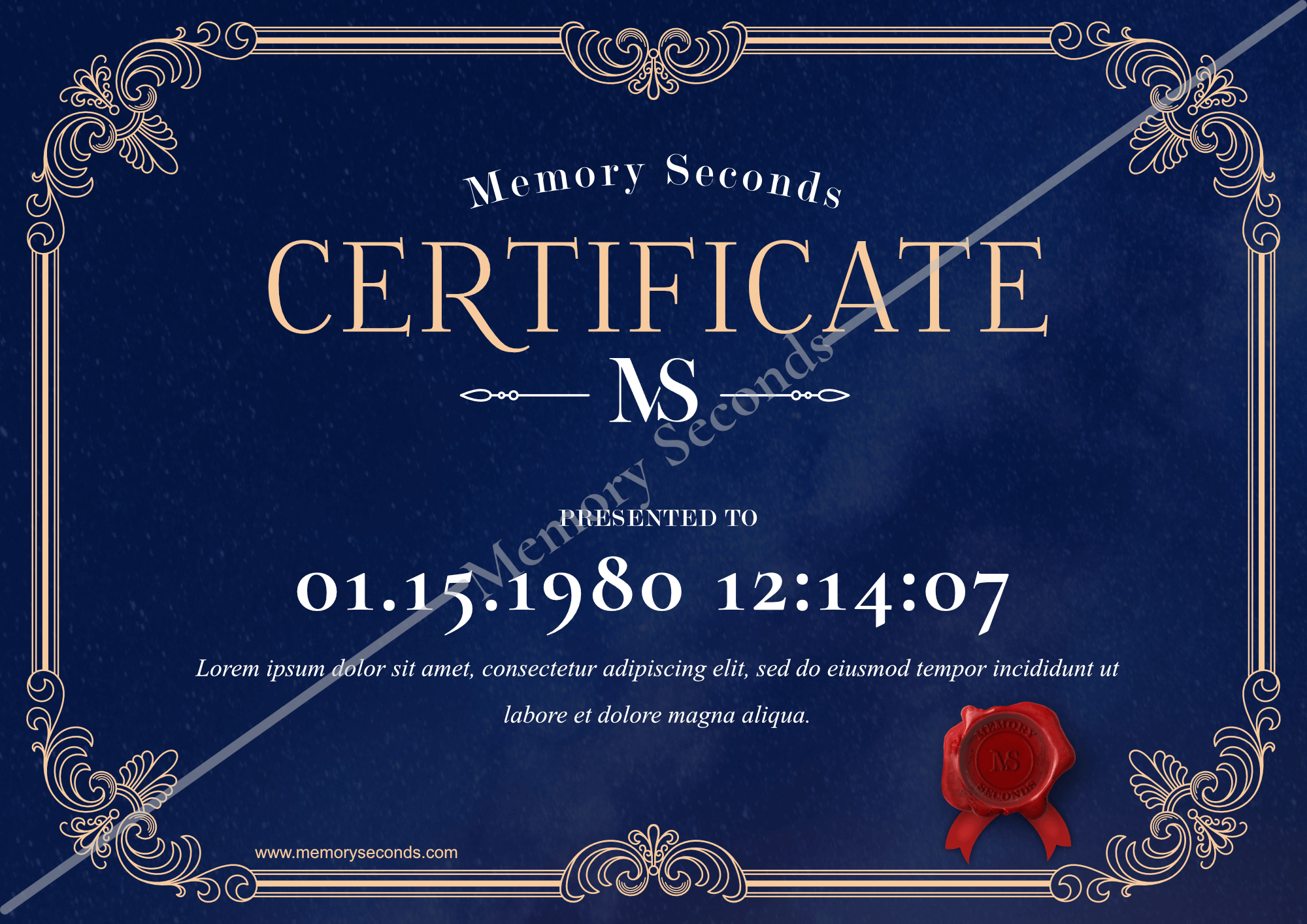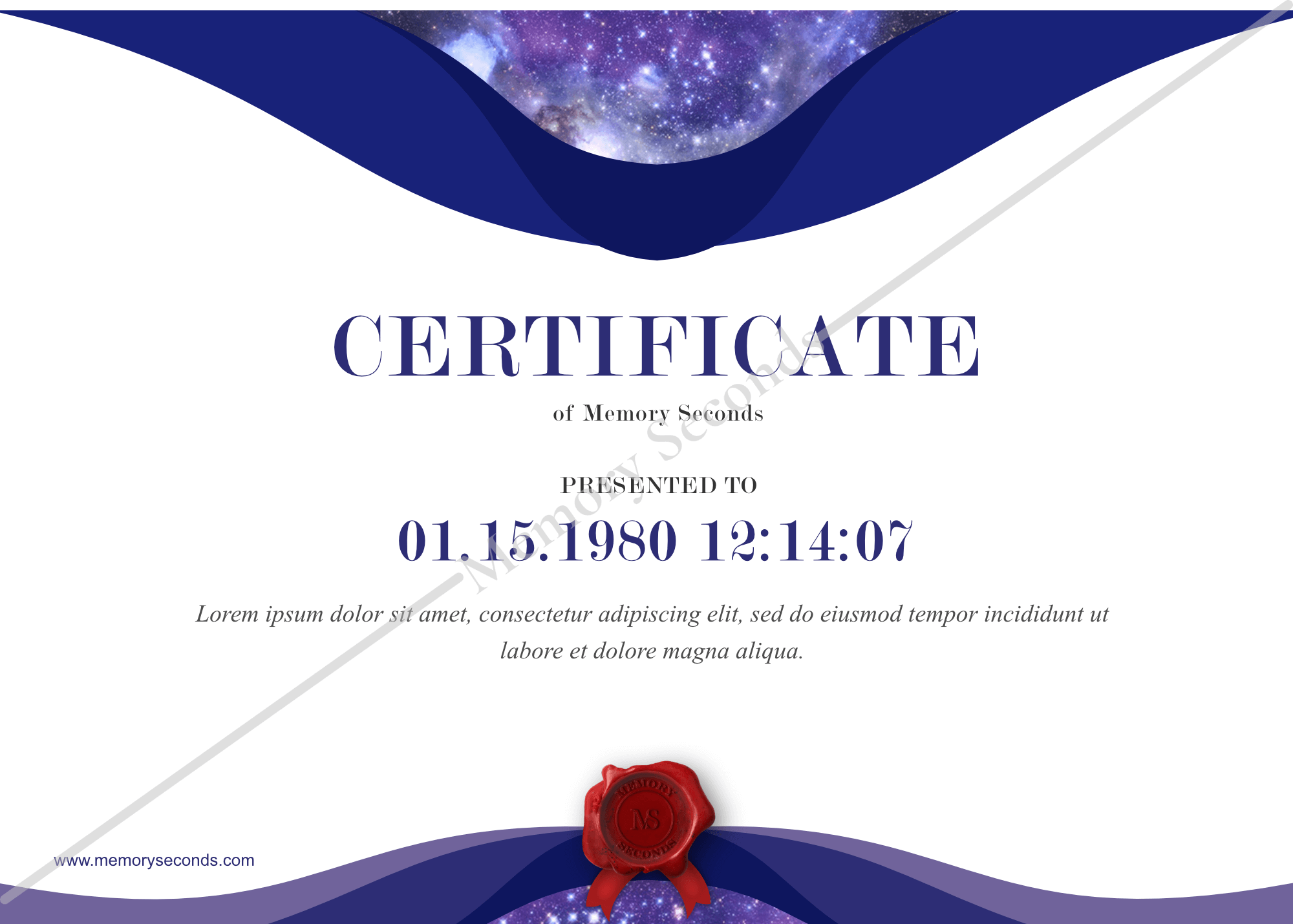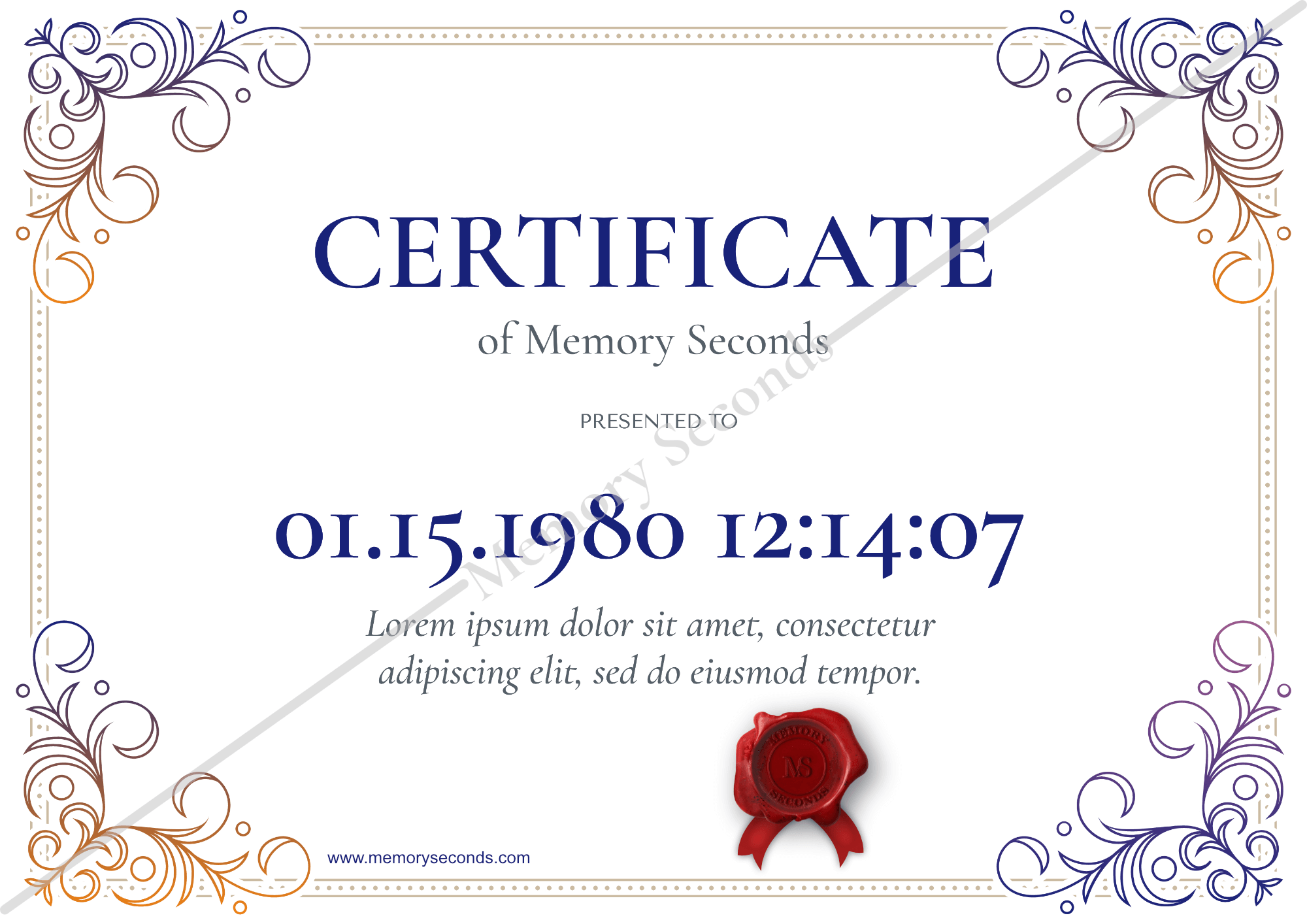 We will send you an email Certificate of every selected, bought and registered second. After indicating the exact time of your special moment, you can edit the text of the Certificate yourself.